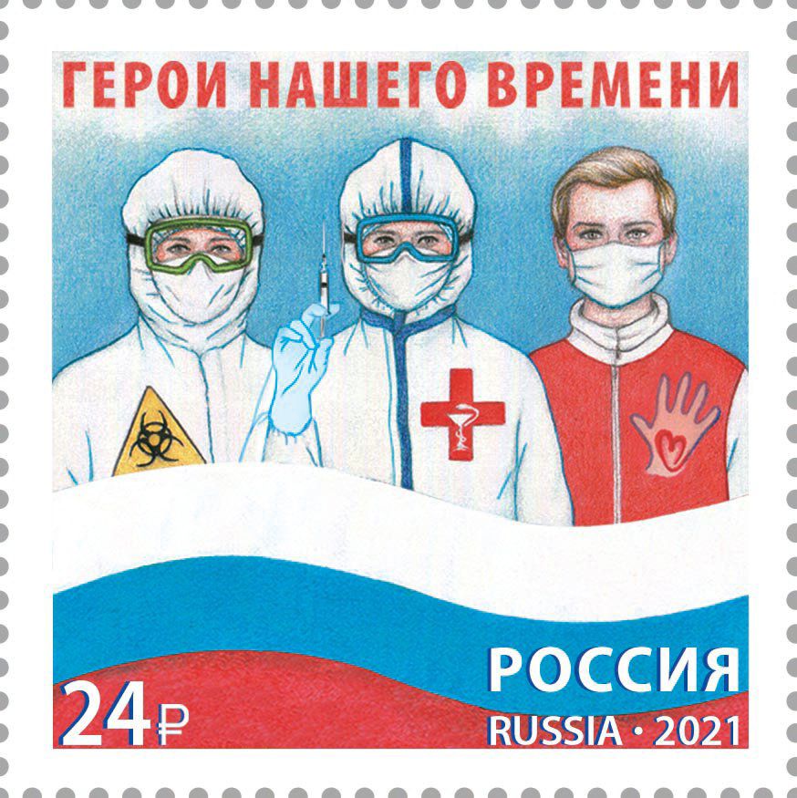На новой почтовой марке изображены медицинские работники и волонтер с надписью «Герои нашего времени». Эскиз разработала художник из Екатеринбурга Галина Назаренко.