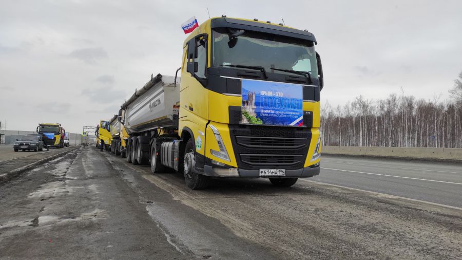 Автопробег спецтехники, украшенной флажками России и наклейками «Крым — это Россия», провела Ассоциация «Предприятия дорожной отрасли Урала» при поддержке министерства транспорта и дорожного хозяйства Свердловской области. Колонна из 20 спецмашин, в том числе комбинированные дорожные машины и самосвалы, проехали по участку Екатеринбургской кольцевой автодороги, соединяющему Полевской тракт с Пермским.