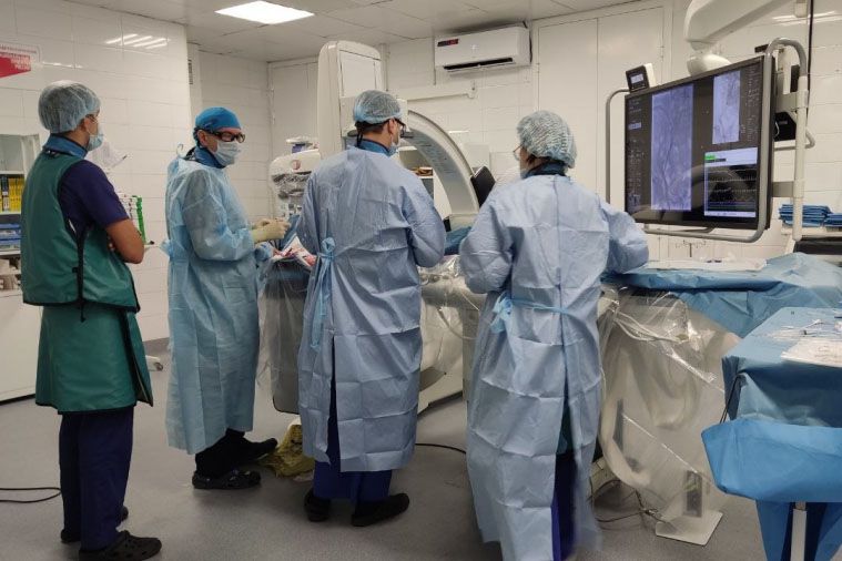 Для углублённой диагностики свердловчанину провели компьютерную томографию, которая помогла обнаружить причину сосудистой катастрофы: левая средняя мозговая артерия была закупорена тромбом. Врачи начали тромболитическую терапию, чтобы растворить перекрывший кровоток сгусток, а затем в рентгенэндоваскулярной операционной под местной анестезией успешно выполнили механическую тромбэкстракцию: через бедренную артерию с помощью микрокатетера проникли к месту закупорки в сосуде головного мозга, захватили тромб специальными инструментами и вытянули его из артерии.