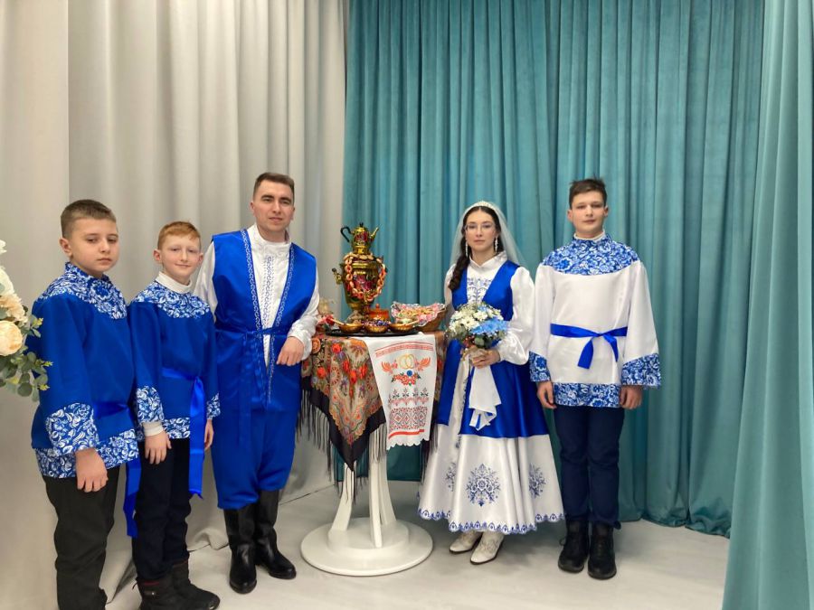 Пара приняла решение зарегистрировать брак в русском стиле. На регистрации «учительской» молодых встречал фольклорно— этнографический ансамбль «Колокольчики». По окончании регистрации молодым подарили куклу «берегиню» — славянский оберег, защищающий семью от ссор и неудач.