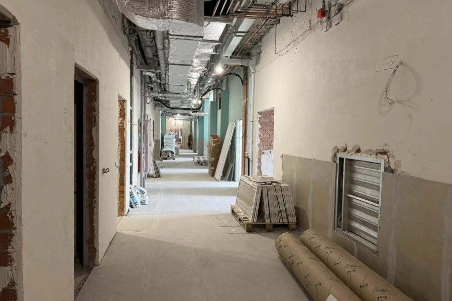 Завершается работа над окнами и витражами. Готовность фасада составляет 82%. Монтаж внутренних инженерных сетей также близок к завершению: водоснабжение и канализация готовы на 78%, отопление и вентиляция — на 86%.